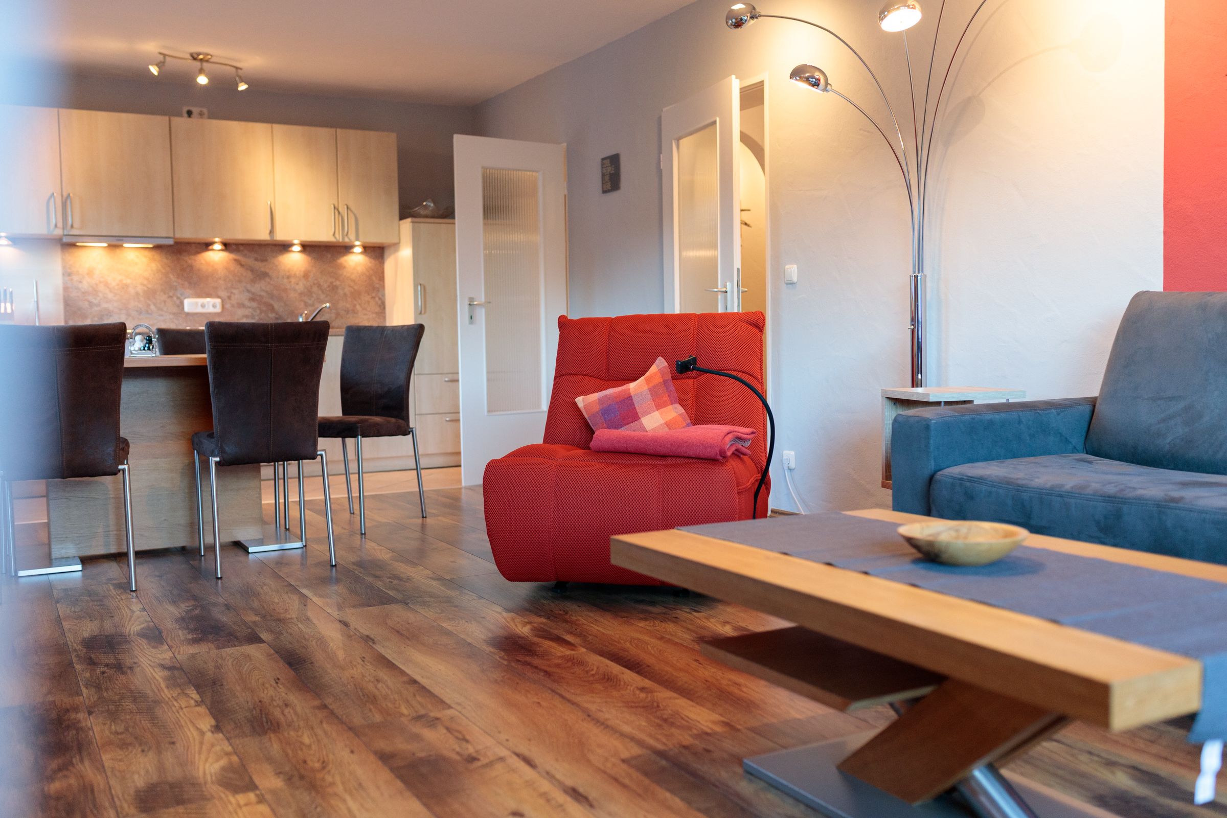 Die hell und modern eingerichtete 2-Zimmerferienwohnung verfügt über ein großzügiges Wohnzimmer mit gemütlicher Schlafcouch und bequemem smart Komfortsessel, sowie einer offenen Küche als auch einem schönen Esstisch. Die Küche ist mit einem Herd mit Cerankochfeld, Backofen, Spülmaschine und allen wichtigen Utensilien vollständig ausgestattet. Schlafzimmer mit Boxspringbett, auch einzeln stellbar. Hochwertige Decken und Kissen sorgen für traumhaften Schlafkomfort. Bad mit Dusche, Badewanne und WC, sowie Fußbodenheizung. Waschmaschine und Trockner sind auch vorhanden.