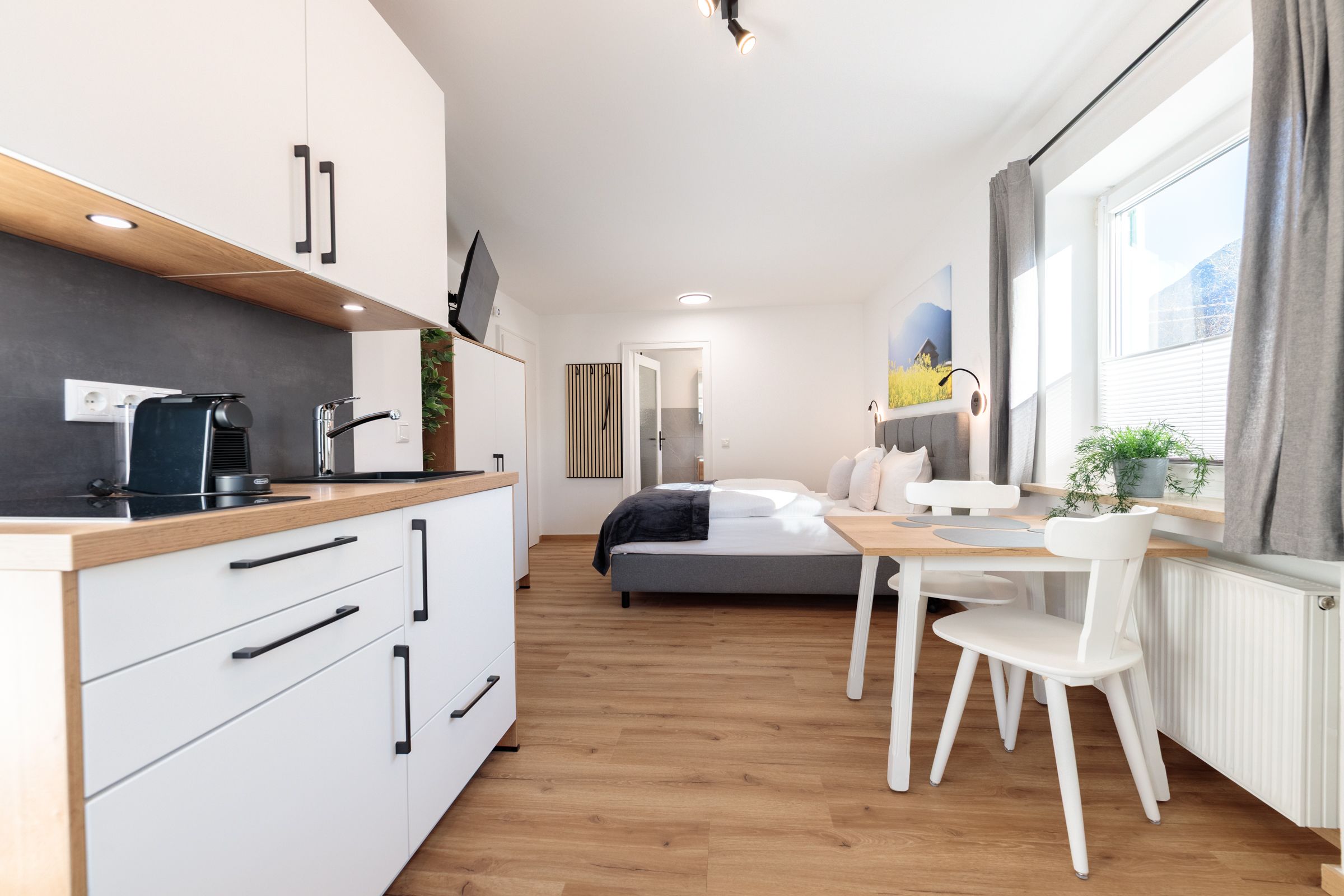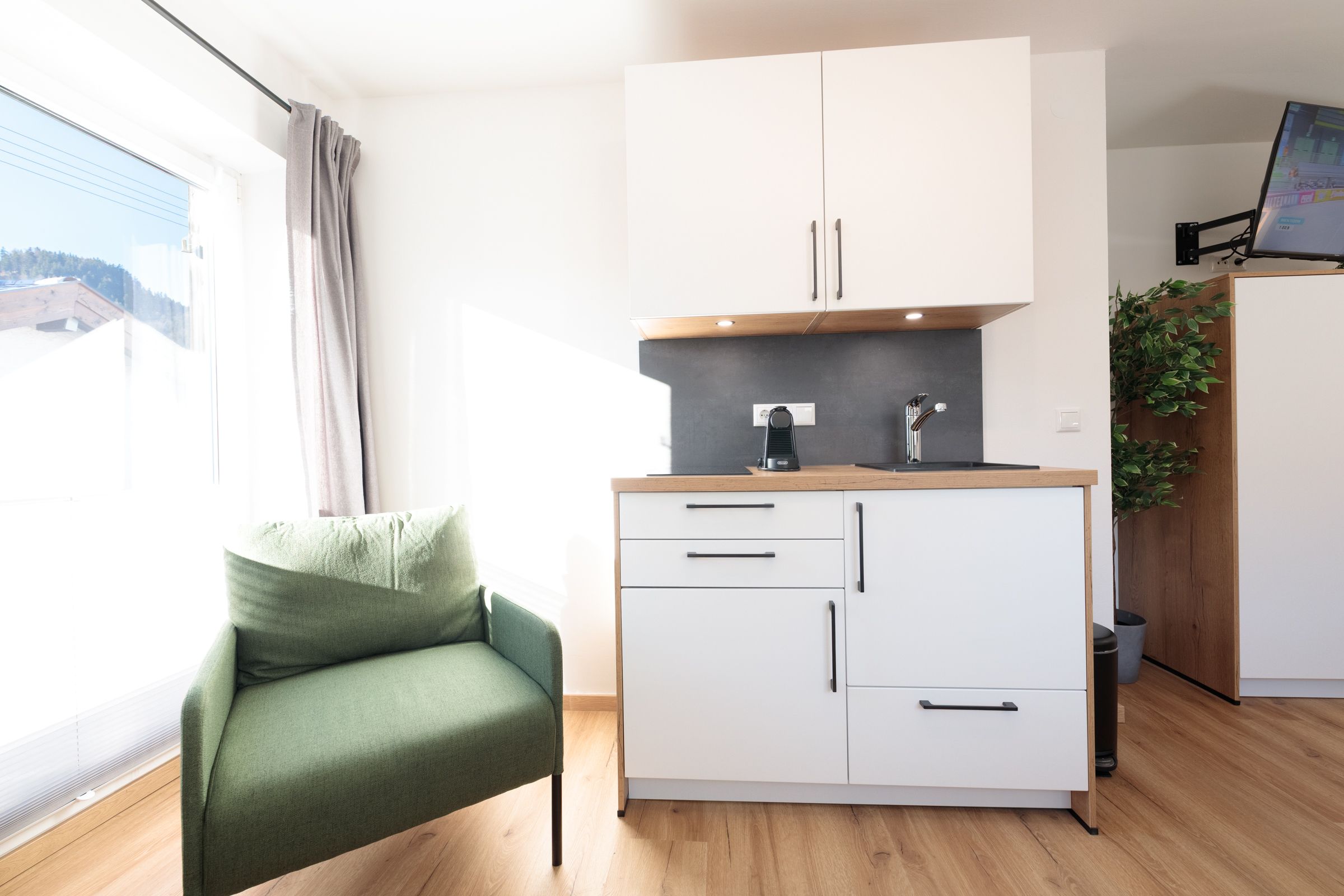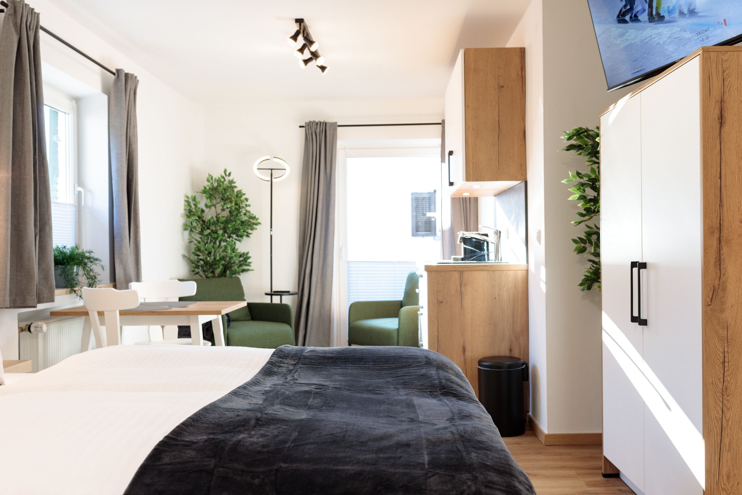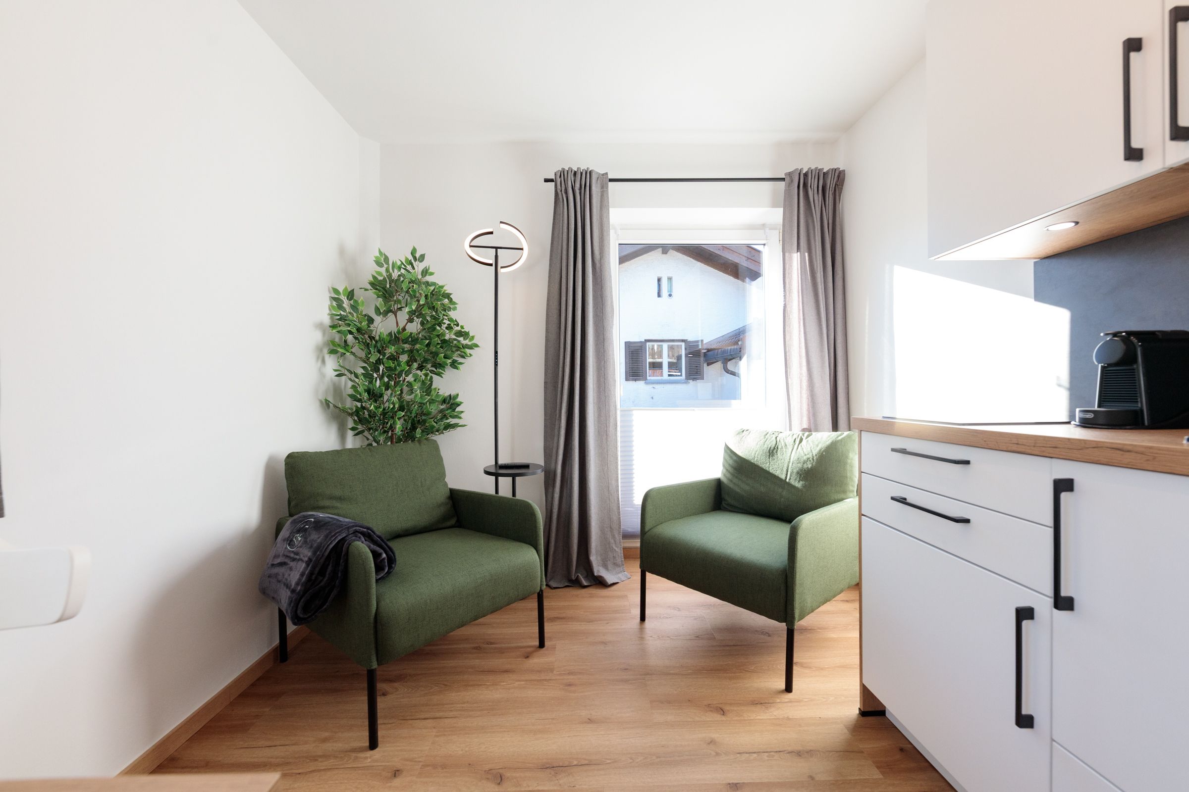 Die Wohnung „Frühlingserwachen“ im Haus „Heu22“ bietet auf rund 25 m² ein angenehmes Wohngefühl für zwei Personen und lädt zum Ankommen und Entspannen ein. In diesem liebevoll gestalteten Einzimmer-Apartment sind Schlafbereich, Leseecke und Küchenzeile harmonisch miteinander verbunden und schaffen einen hellen, freundlichen Raum, der Komfort und Gemütlichkeit vereint. Die kleine Leseecke mit zwei Sesseln lädt dazu ein, bei einem guten Buch oder einer Tasse Kaffee zur Ruhe zu kommen, während der TV für entspannte Abende sorgt.