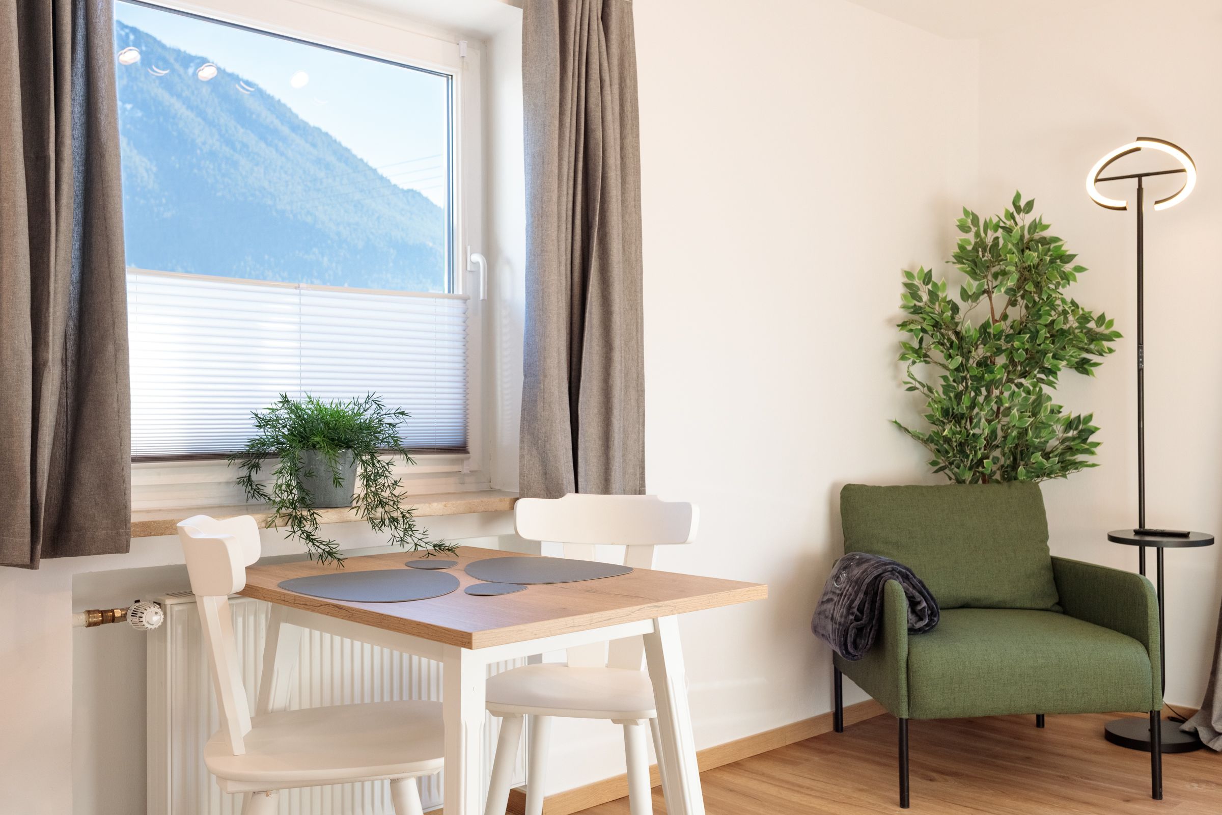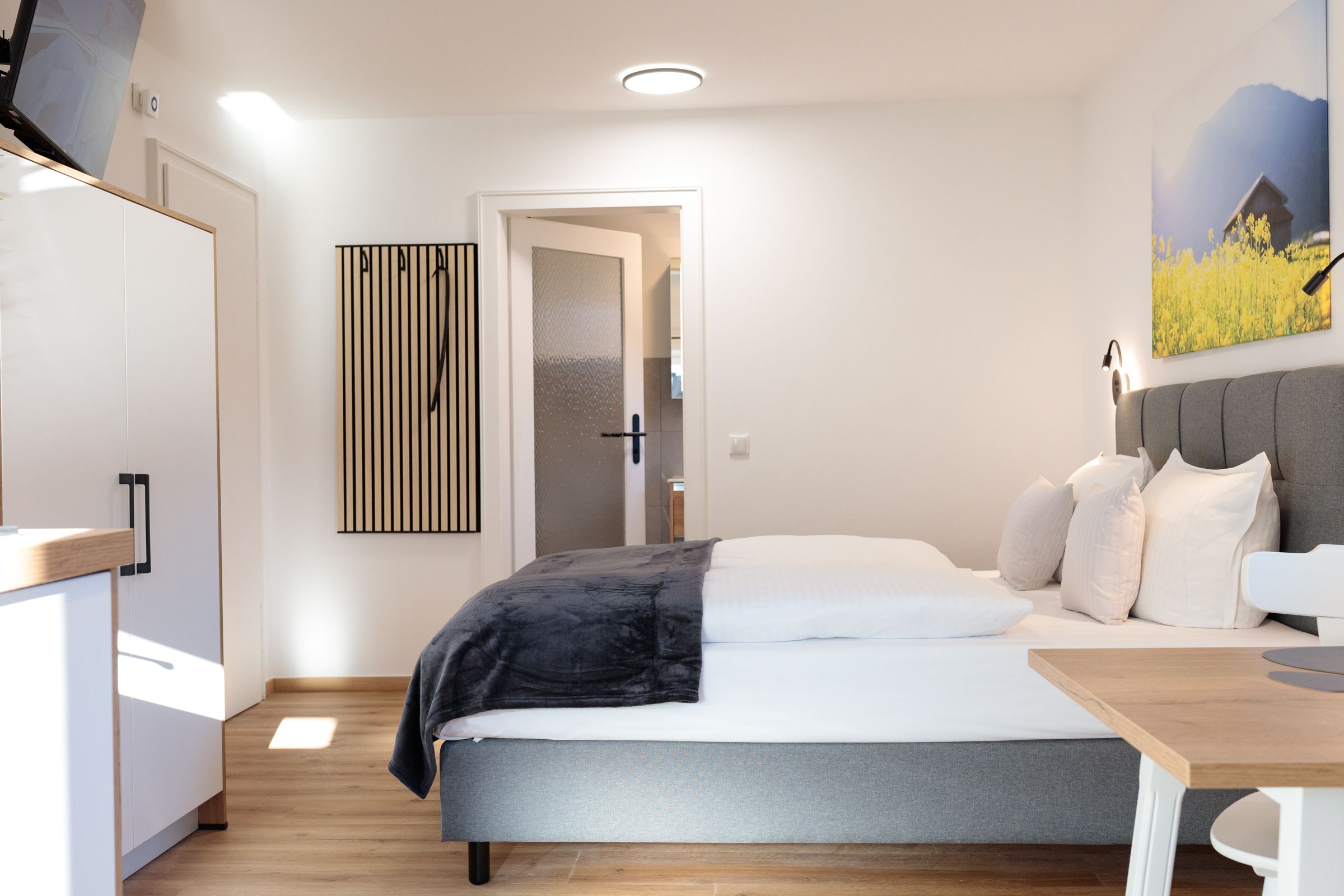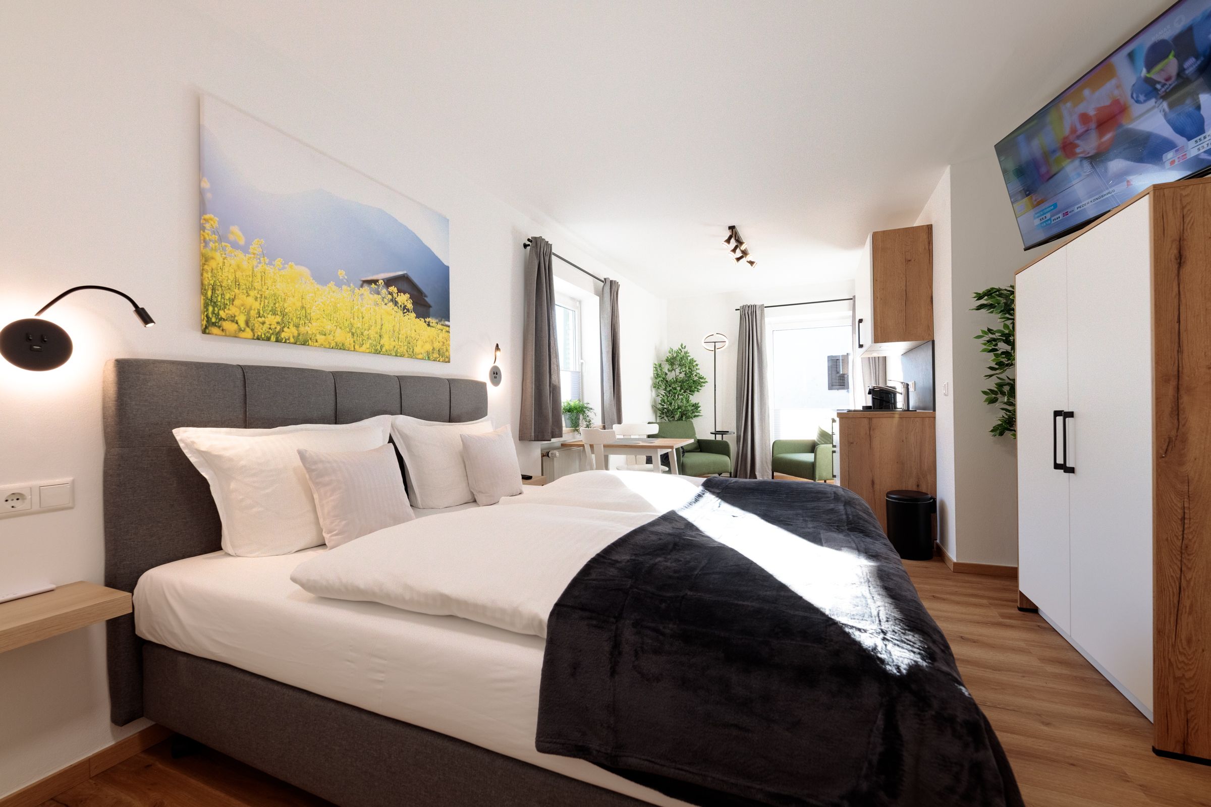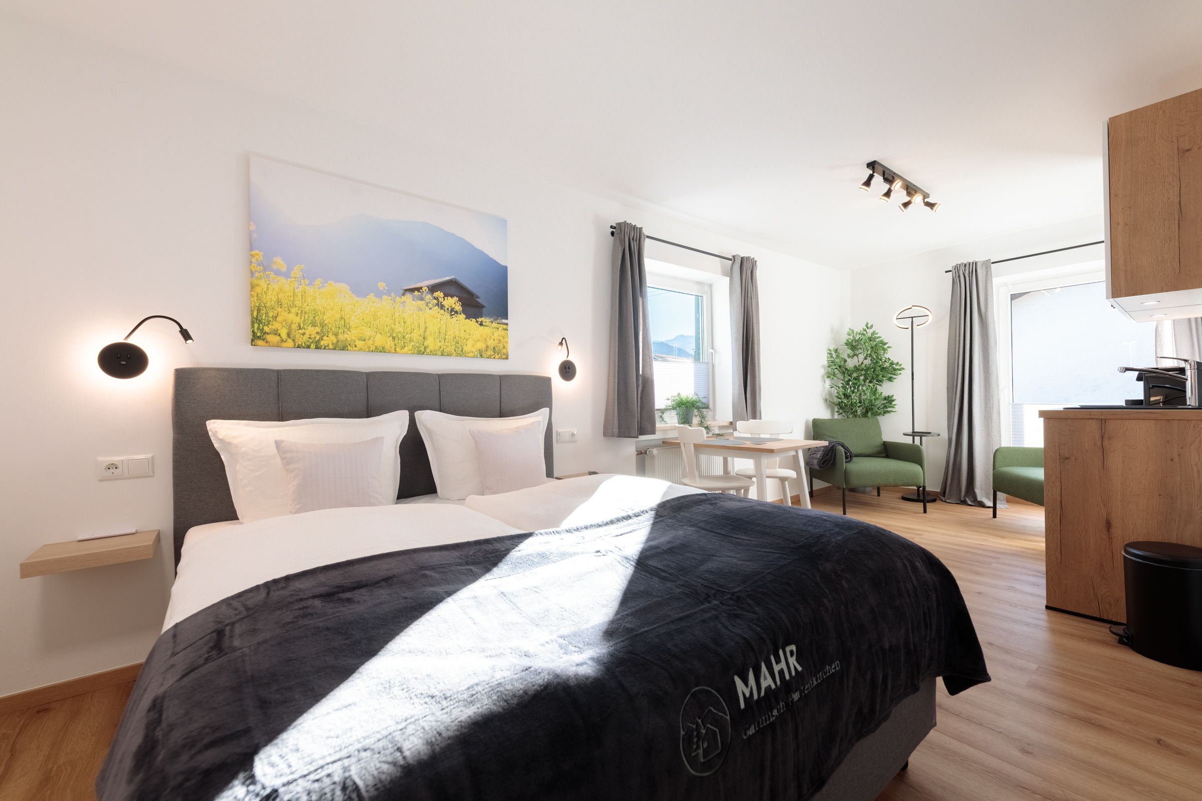 Die Wohnung „Frühlingserwachen“ im Haus „Heu22“ bietet auf rund 25 m² ein angenehmes Wohngefühl für zwei Personen und lädt zum Ankommen und Entspannen ein. In diesem liebevoll gestalteten Einzimmer-Apartment sind Schlafbereich, Leseecke und Küchenzeile harmonisch miteinander verbunden und schaffen einen hellen, freundlichen Raum, der Komfort und Gemütlichkeit vereint. Die kleine Leseecke mit zwei Sesseln lädt dazu ein, bei einem guten Buch oder einer Tasse Kaffee zur Ruhe zu kommen, während der TV für entspannte Abende sorgt.