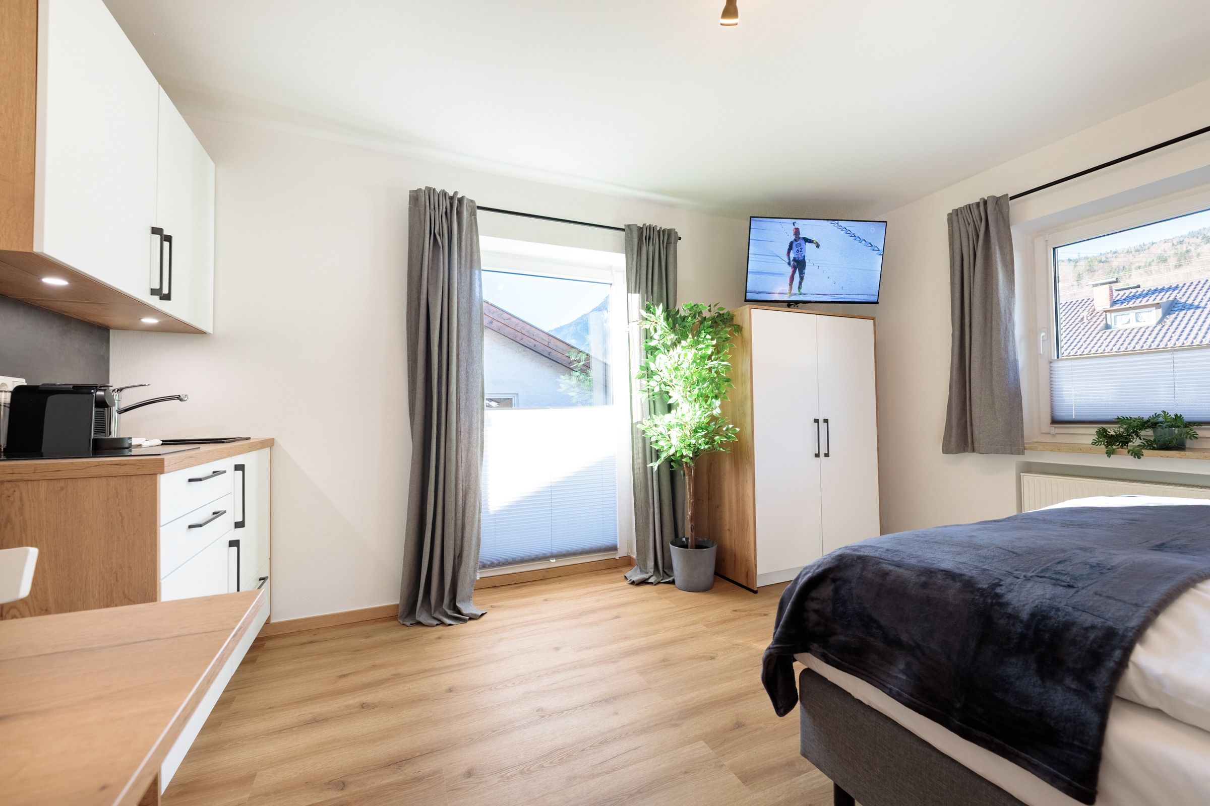 Die Wohnung „Sommerfrische“ im ersten Stock des Hauses „Heu22“ bietet auf großzügigen 33 m² ein besonders angenehmes Wohngefühl und ist ideal für ein bis zwei Personen. Das Apartment wurde vollständig renoviert und mit viel Liebe zum Detail eingerichtet, sodass ein helles, modernes Ambiente entstanden ist, in dem man sich sofort wohlfühlt. Das komfortable Boxspringbett (1,60 m) sorgt für erholsame Nächte und entspannte Morgen.
