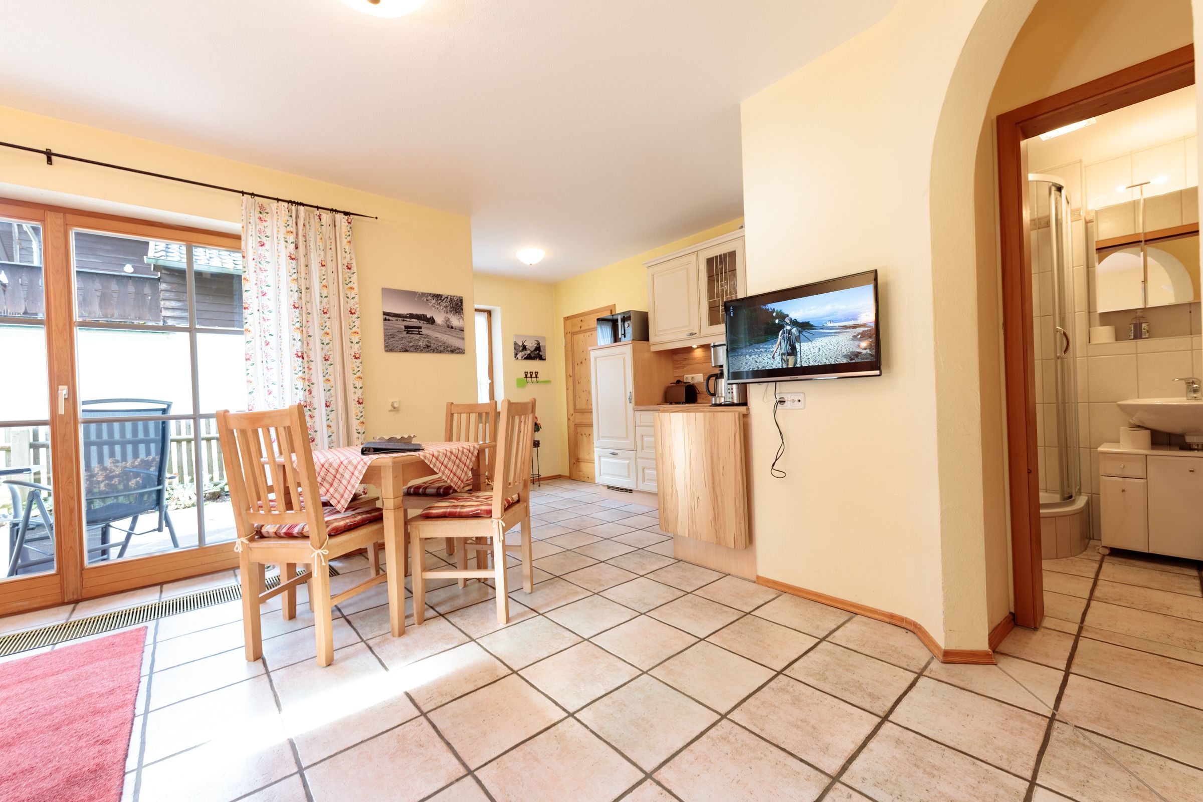 The apartment is thoughtfully designed with a warm and inviting atmosphere. The bedroom features a comfortable double bed, ensuring restful nights, while the living and dining area is furnished with a cozy sofa, a dining table with chairs, and a television for your entertainment. From here, you have direct access to the lovingly furnished terrace – the perfect place to start your day with breakfast or unwind in the evening, watching the sunset against the backdrop of the surrounding mountains.
