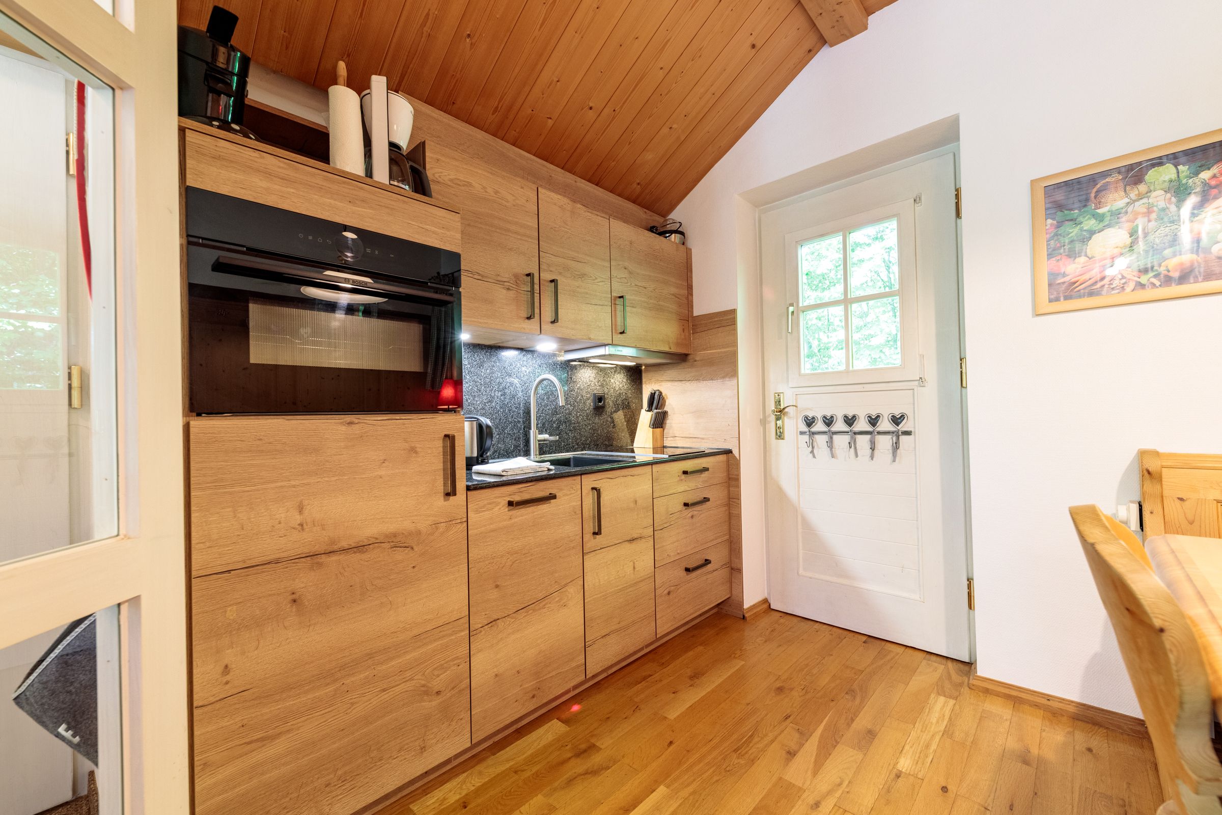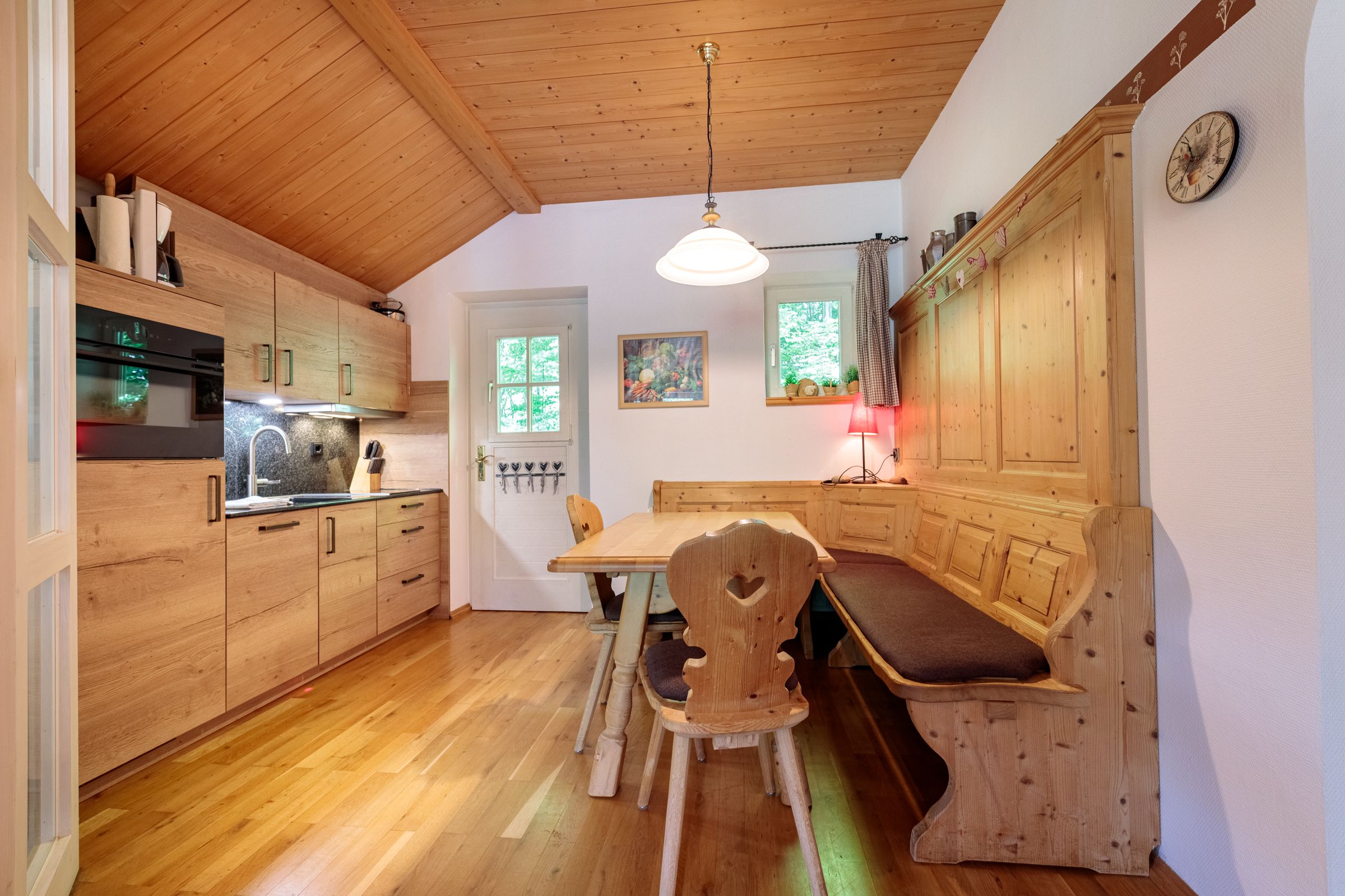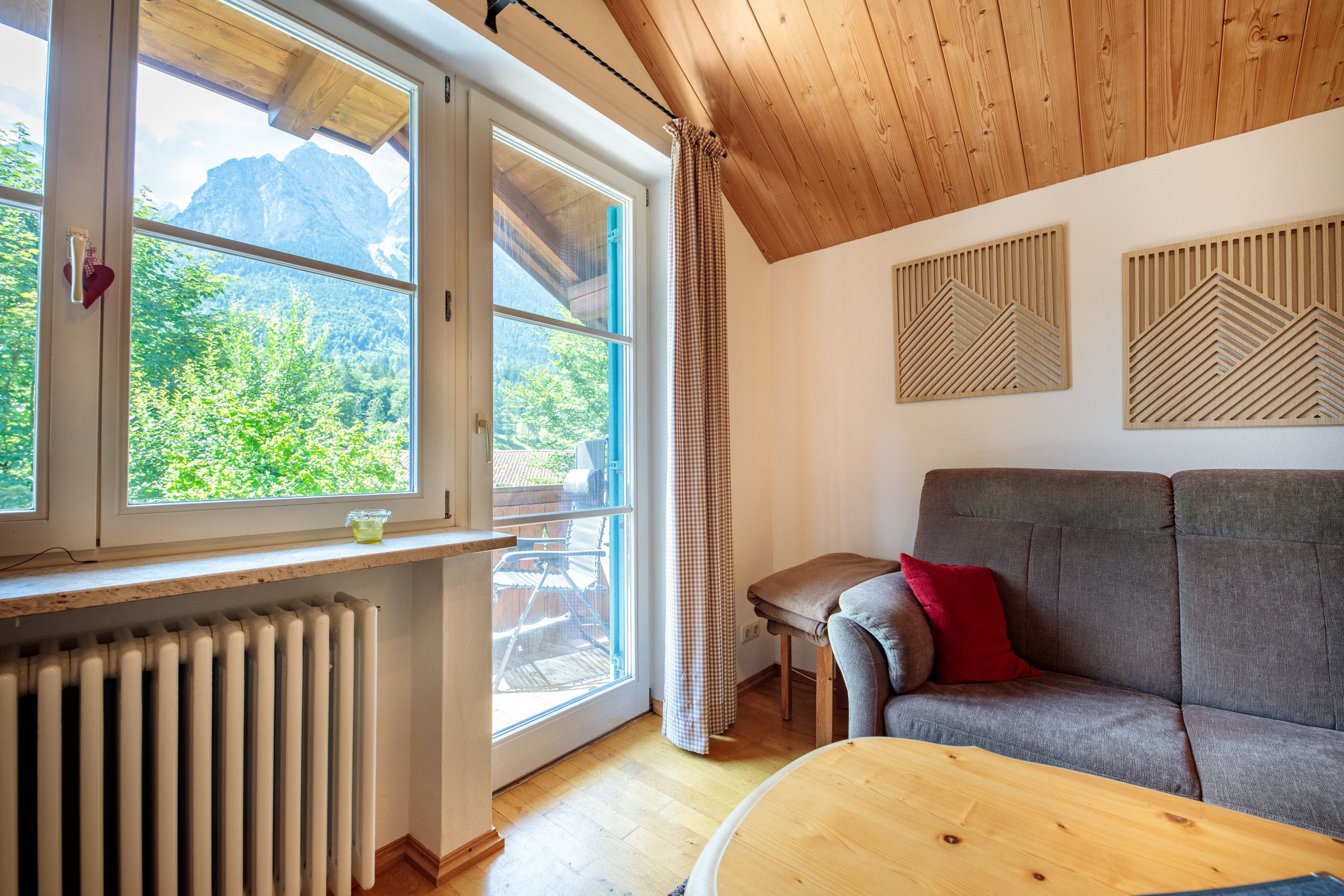 The kitchen is equipped with the necessary appliances, such as a coffee machine, microwave, toaster, dishwasher and electric kettle. The Bavarian wood corner bench looks great. However, there is no oven in the kitchen, but that should not be a problem, because there are many good restaurants in Grainau, which can be reached in a few minutes on foot or by the Eibsee bus.