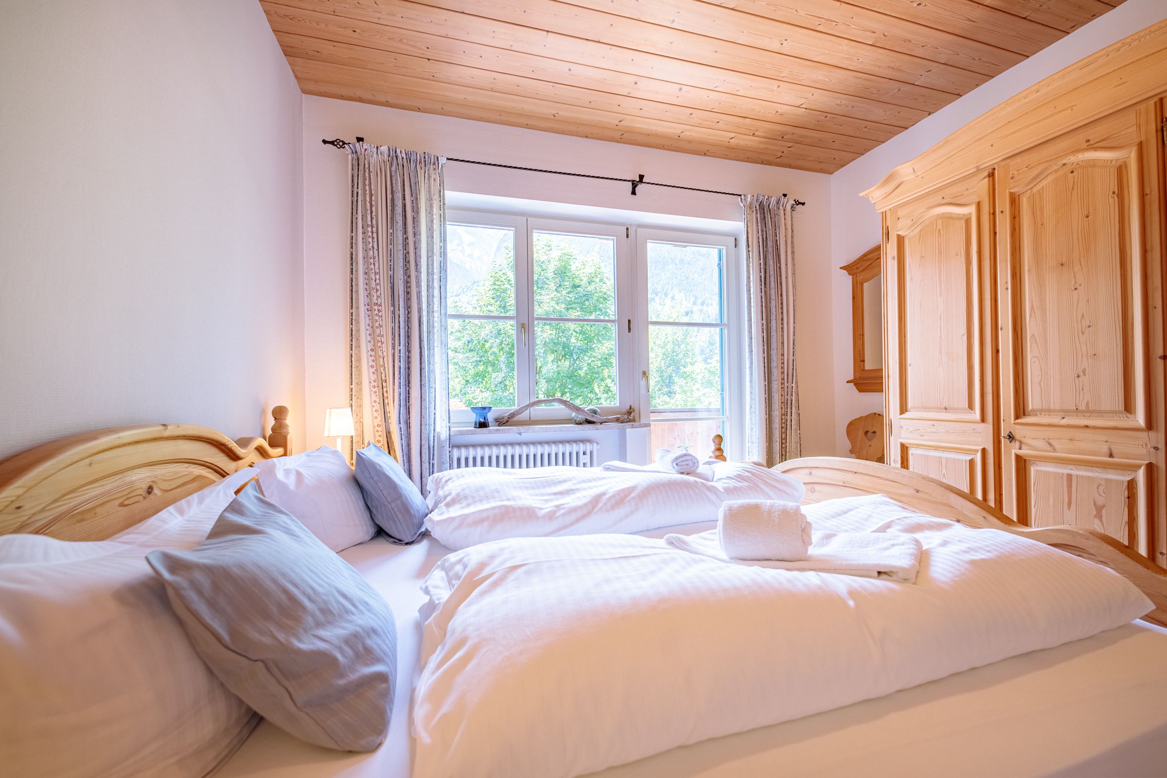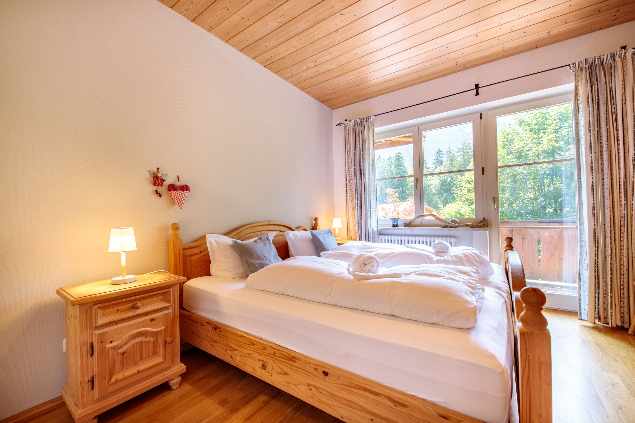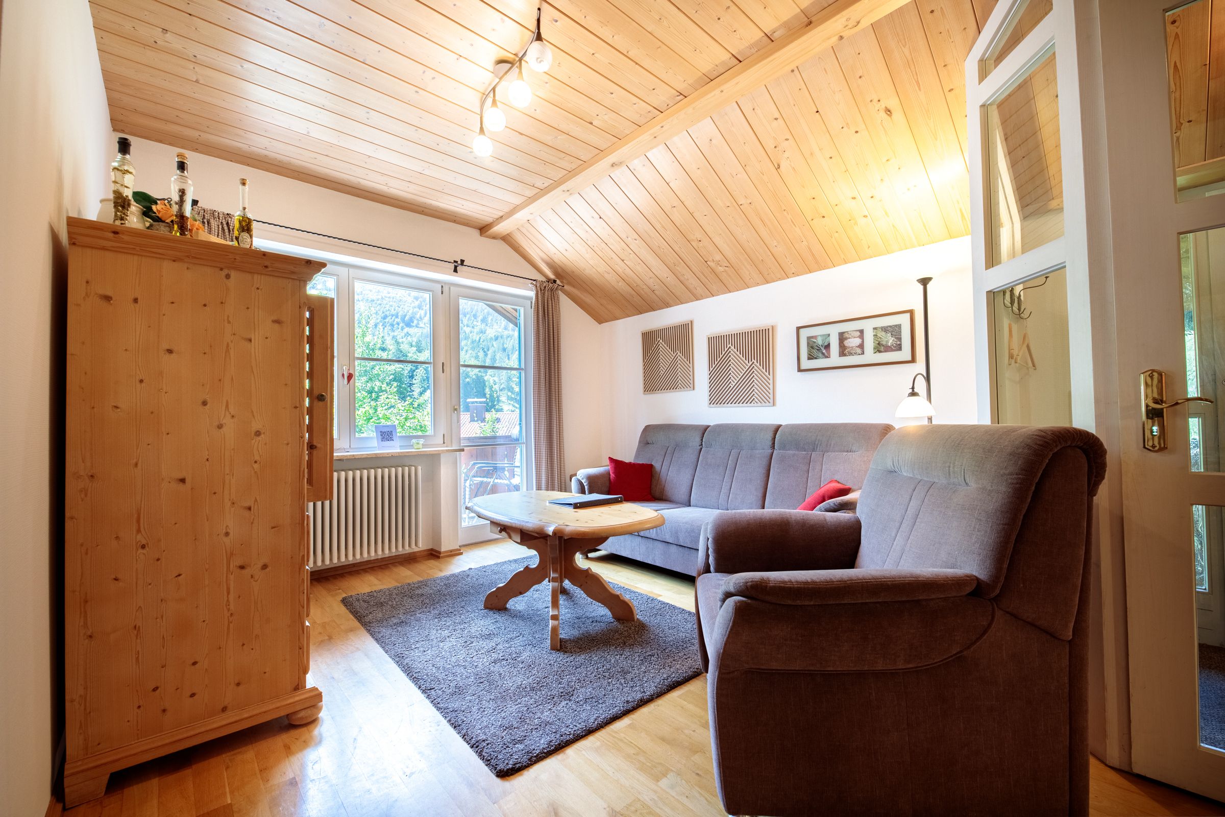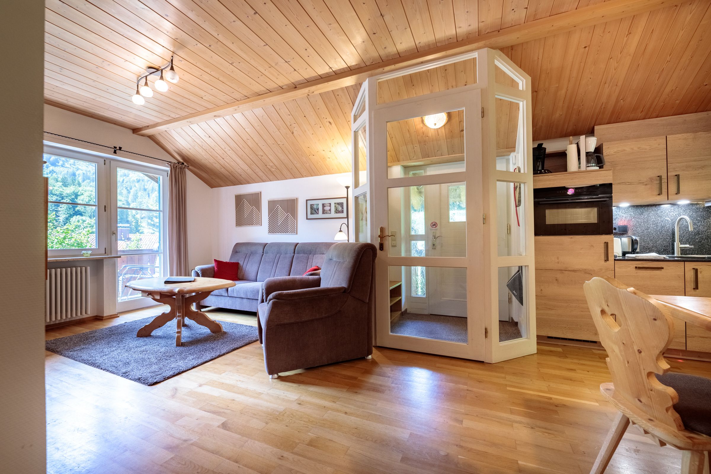 The kitchen is equipped with the necessary appliances, such as a coffee machine, microwave, toaster, dishwasher and electric kettle. The Bavarian wood corner bench looks great. However, there is no oven in the kitchen, but that should not be a problem, because there are many good restaurants in Grainau, which can be reached in a few minutes on foot or by the Eibsee bus.