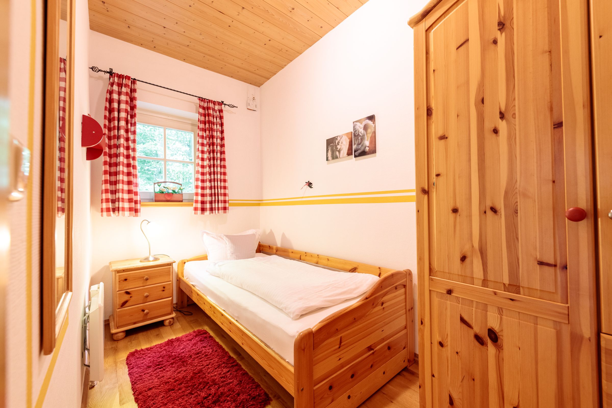 The apartment is very cosy and furnished with comfortable country house furniture, which provides a good atmosphere. In the living room there is a comfortable sofa with a table and a flat screen TV and DVD player. Here you can spend comfortable hours together with your family.