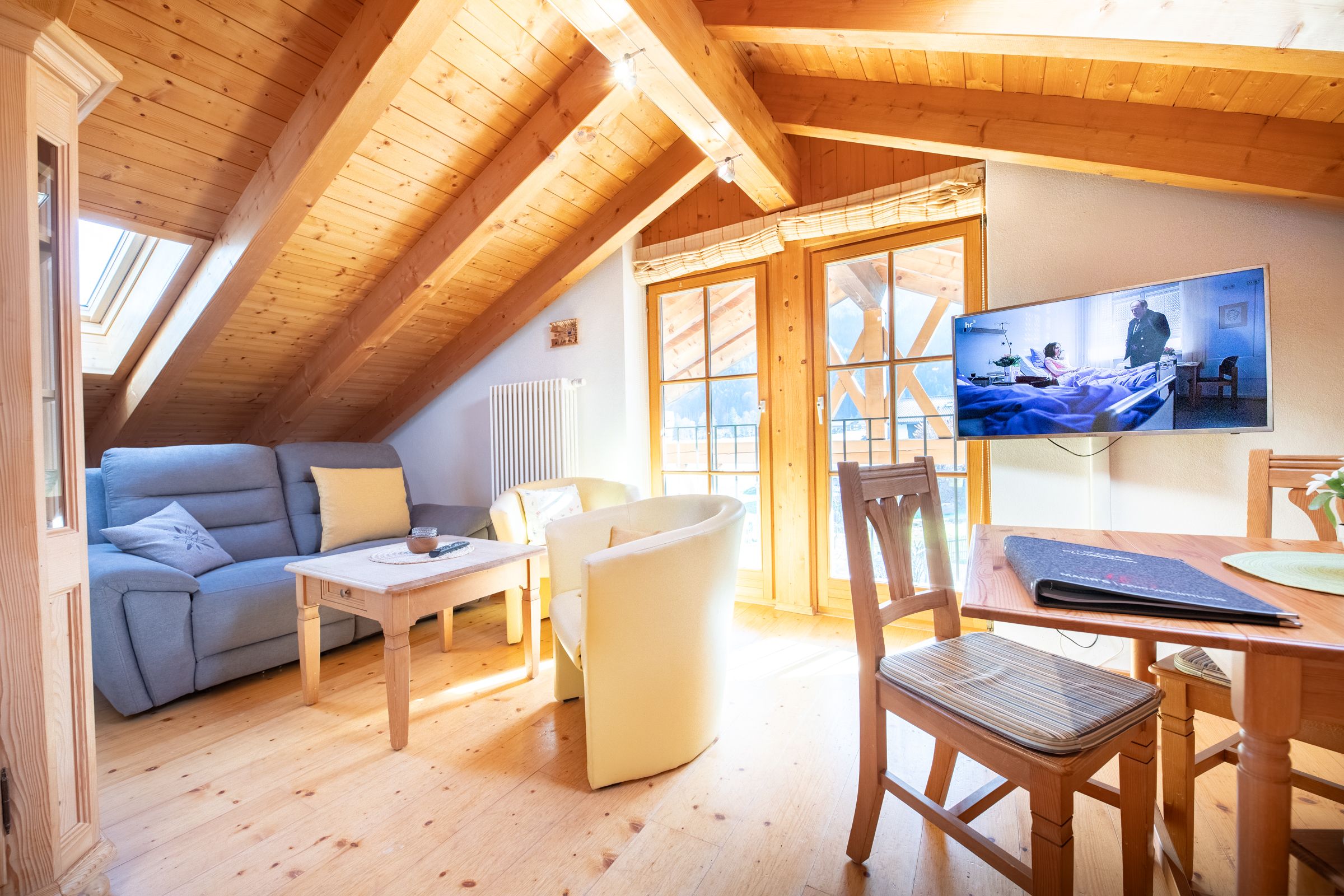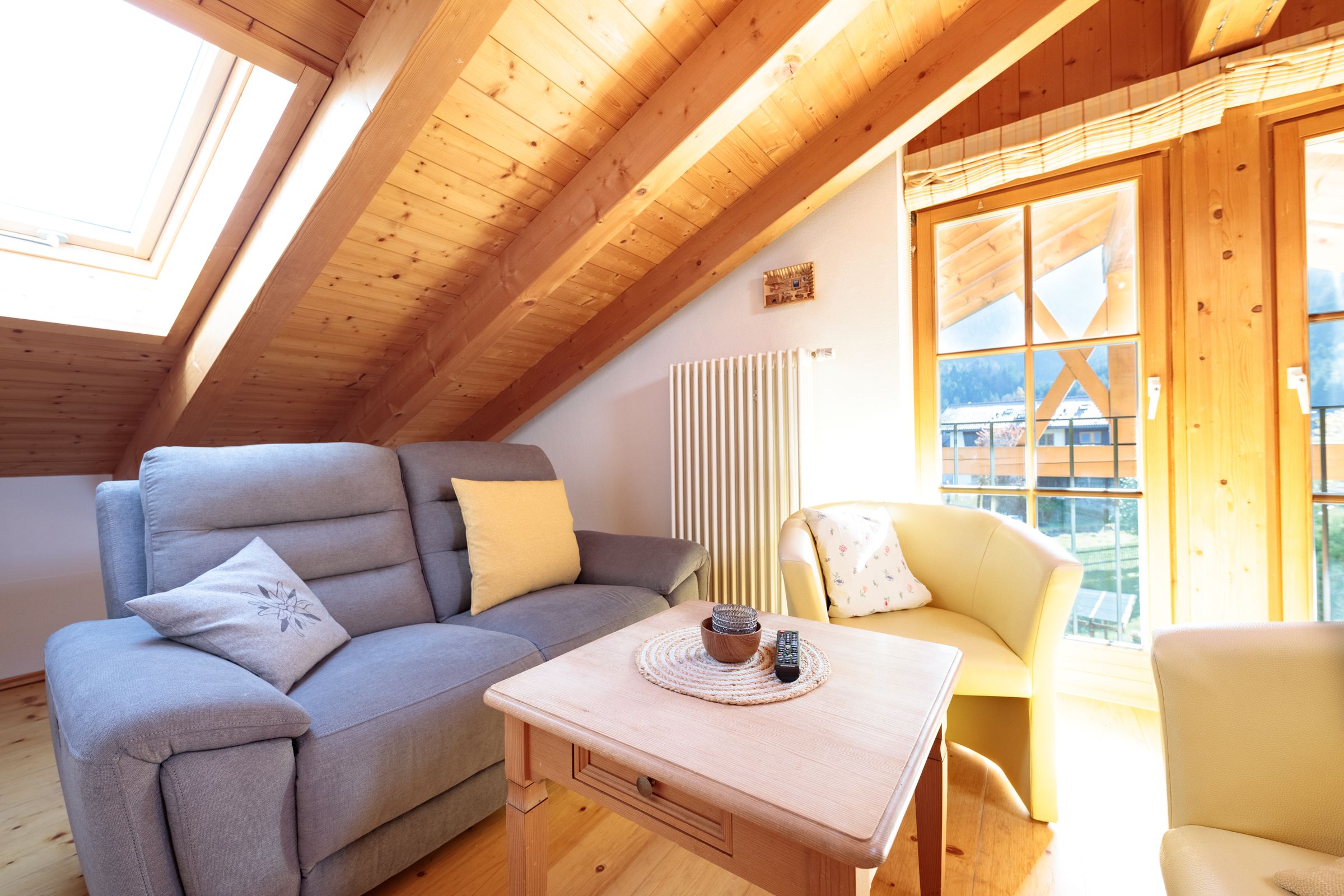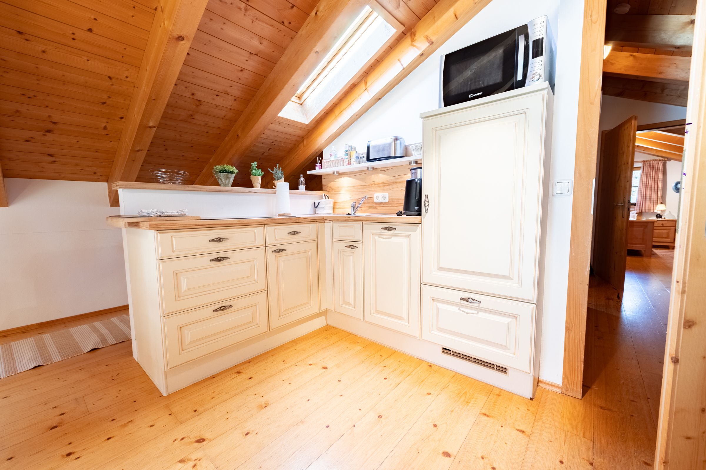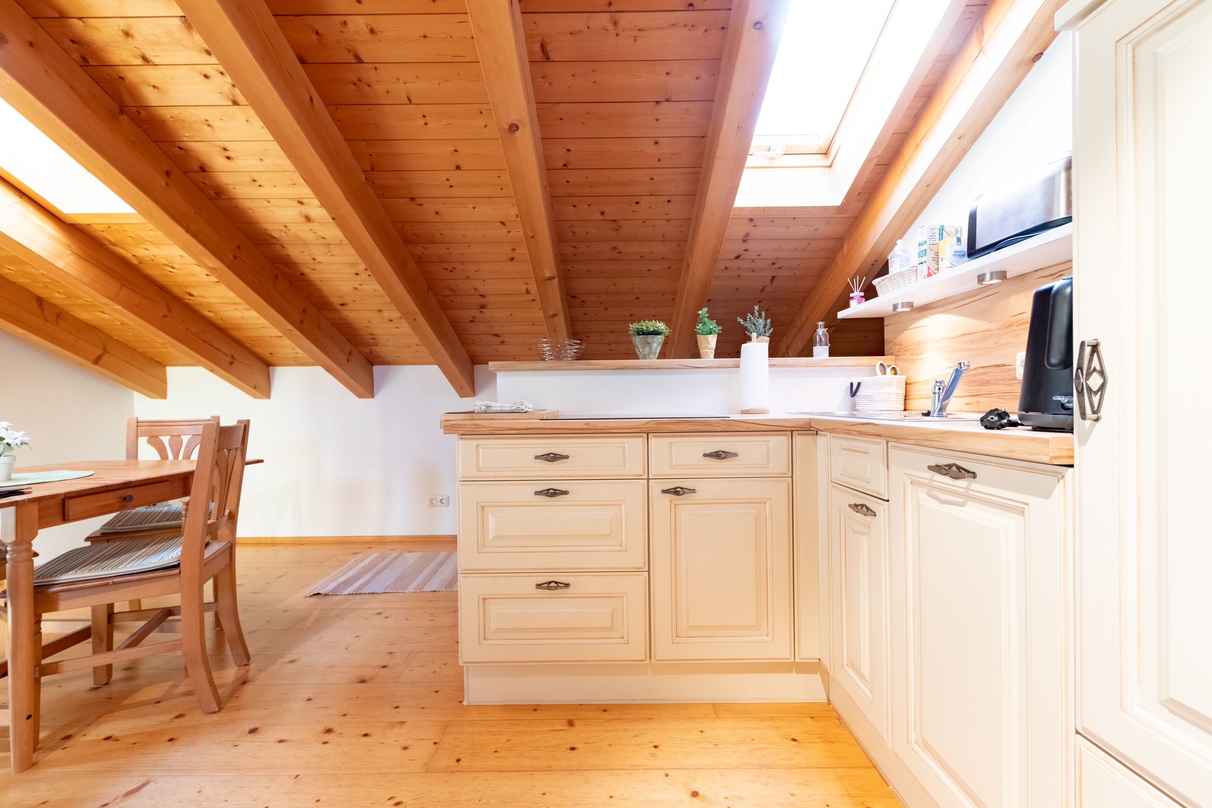The adjacent kitchenette is well equipped for self-catering, with a ceramic hob, microwave, coffee machine, and electric kettle at your disposal. Whether you're preparing a quick meal after a day of adventure or enjoying a relaxed breakfast with a mountain view – everything you need is right here.