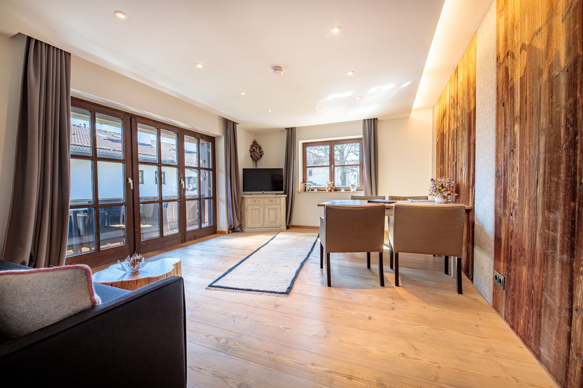 A glass of red wine on the balcony with a view of the Alpspitze - what more could you want? This and much more is offered by the holiday apartment "Sonnenschein". The large balcony is equipped with comfortable balcony furniture, so that you can enjoy the great mountain panorama.