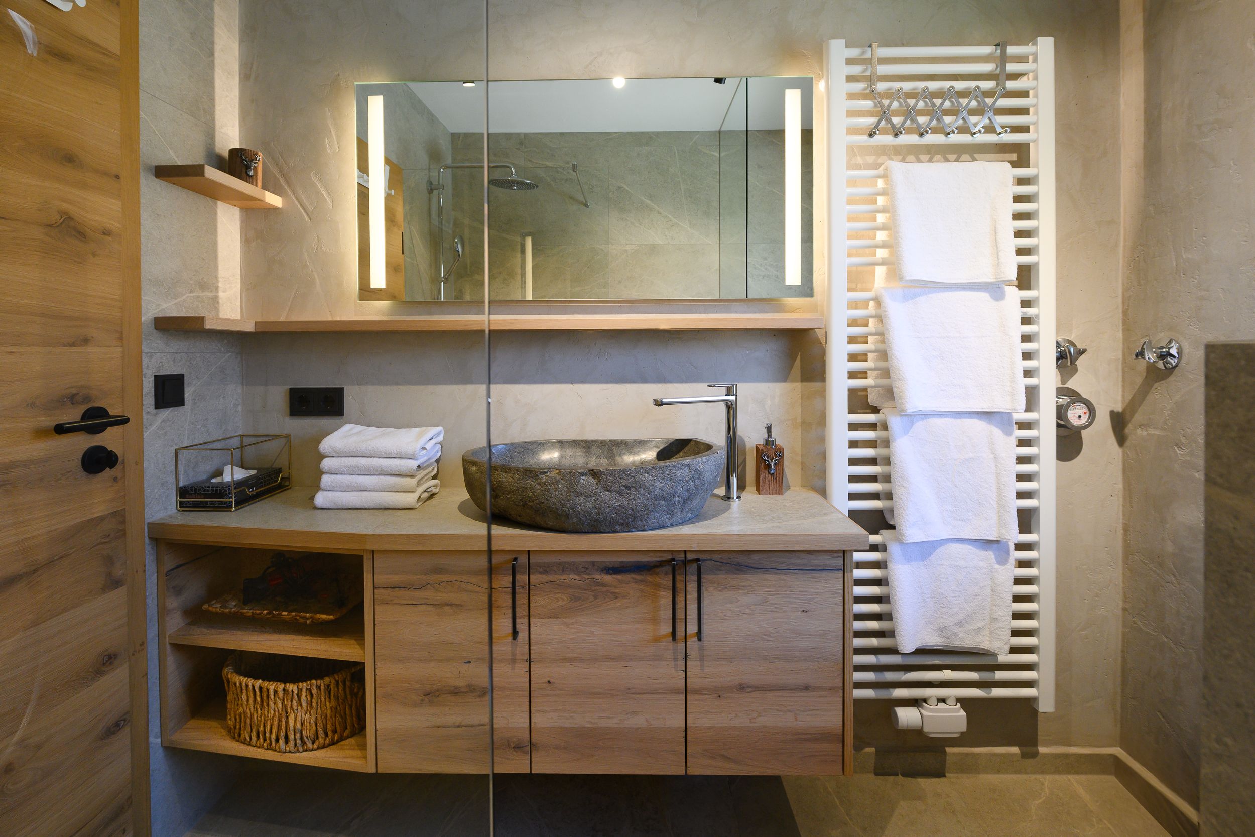 The bathroom of our "Alpenglück" has been newly renovated: two washbasins as well as a ground-level rain shower await you here. Of course, the bathroom also has a toilet.
