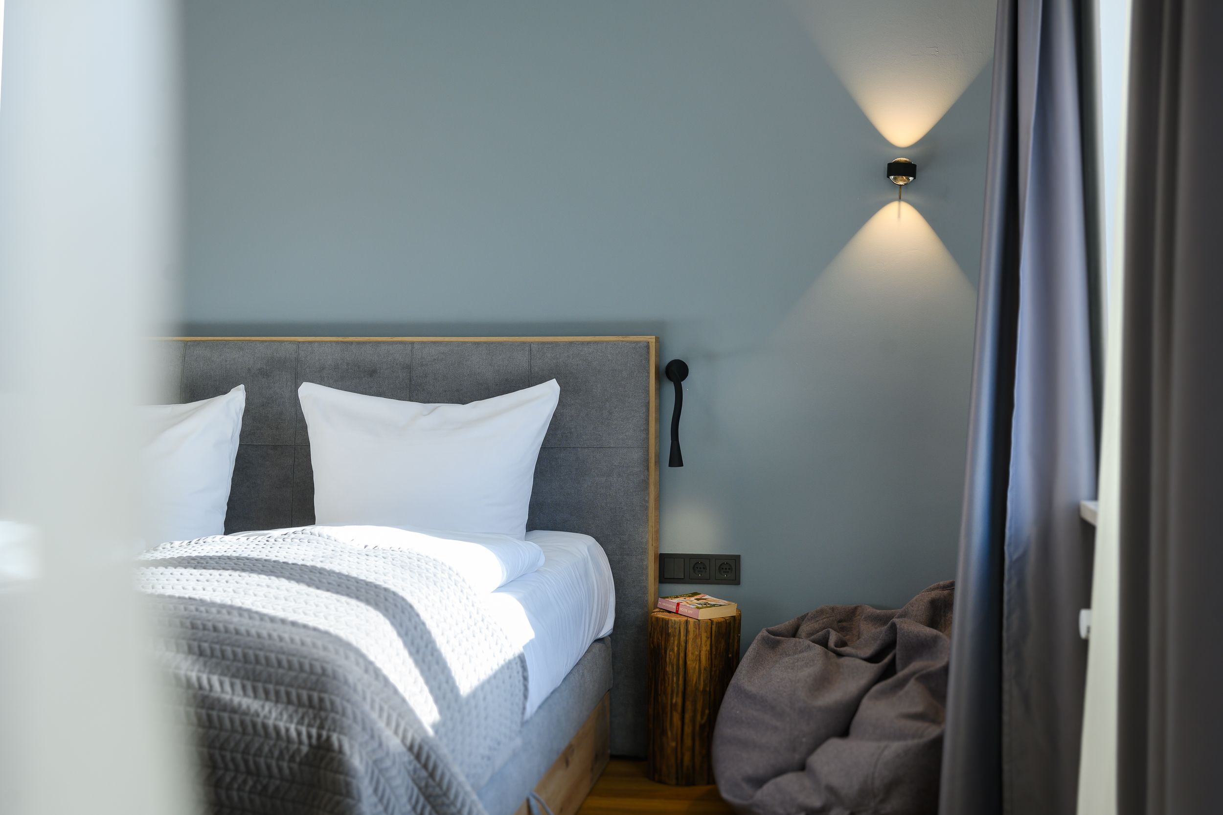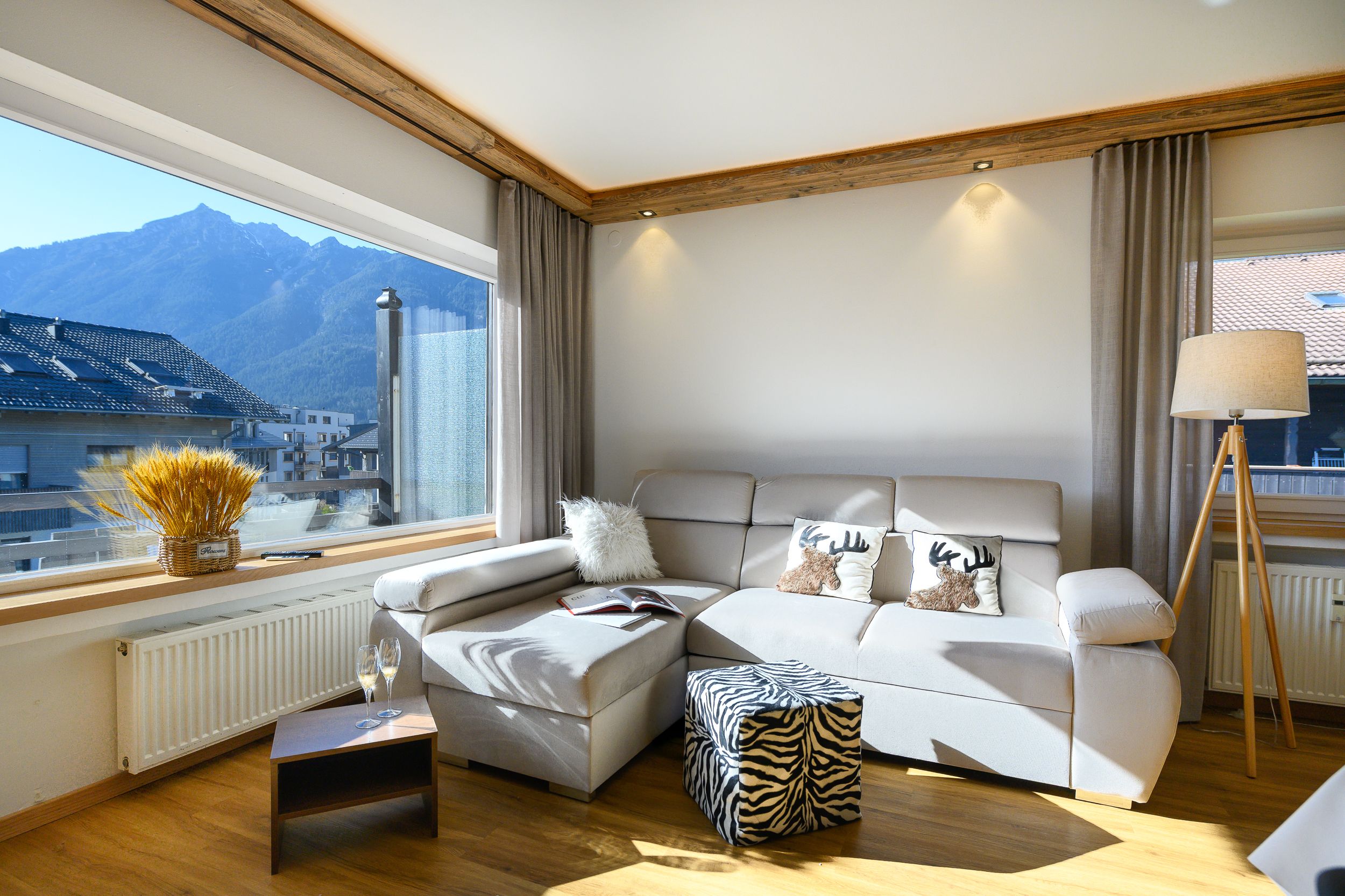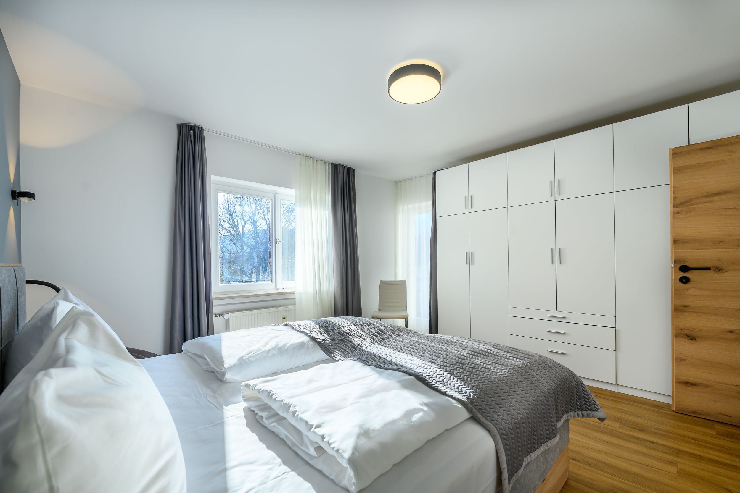 The bedroom of the vacation apartment has been lovingly furnished. A large closet offers space for the entire travel wardrobe. Immediately after waking up, you can enjoy the fresh mountain air: Directly from the bedroom you have access to the second balcony of the apartment. Here you will also be greeted with a great view of the mountains!