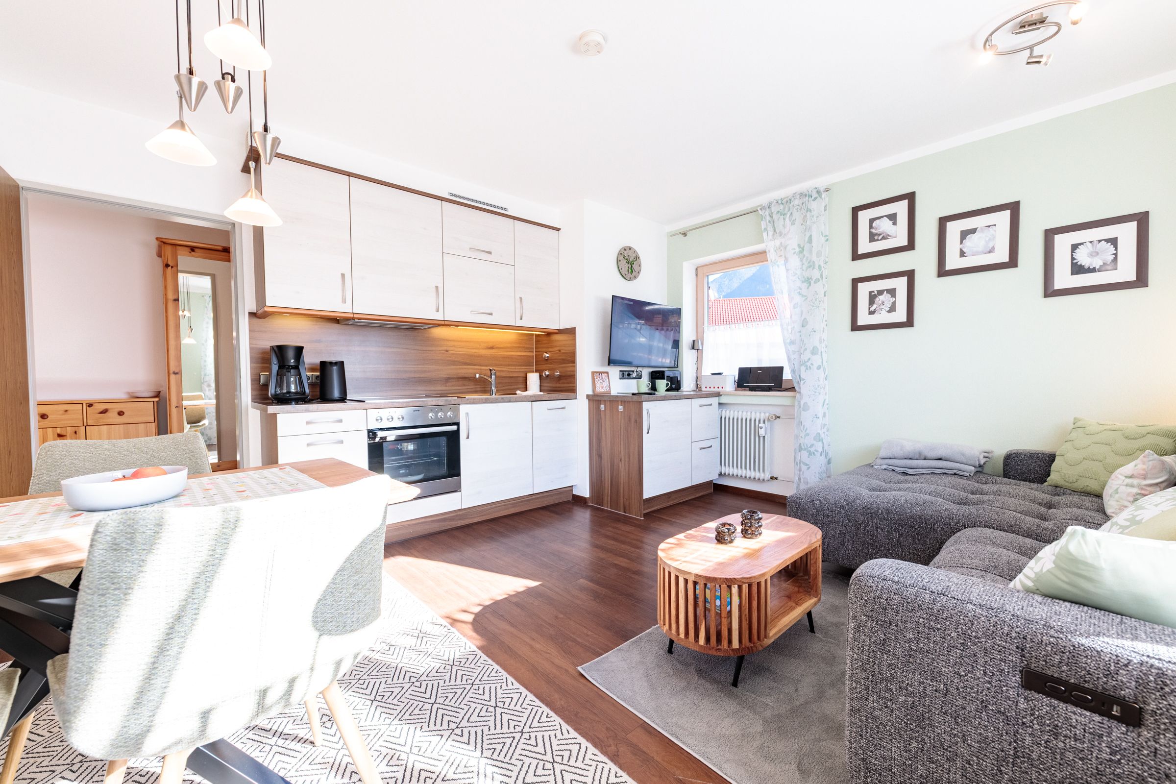 The modern kitchenette is harmoniously integrated into the living space and fully equipped to ensure a carefree stay. An oven, ceramic cooktop, and dishwasher provide contemporary convenience, while a coffee machine and a wide range of kitchen utensils make it easy to prepare anything from a simple breakfast to a cozy dinner.
