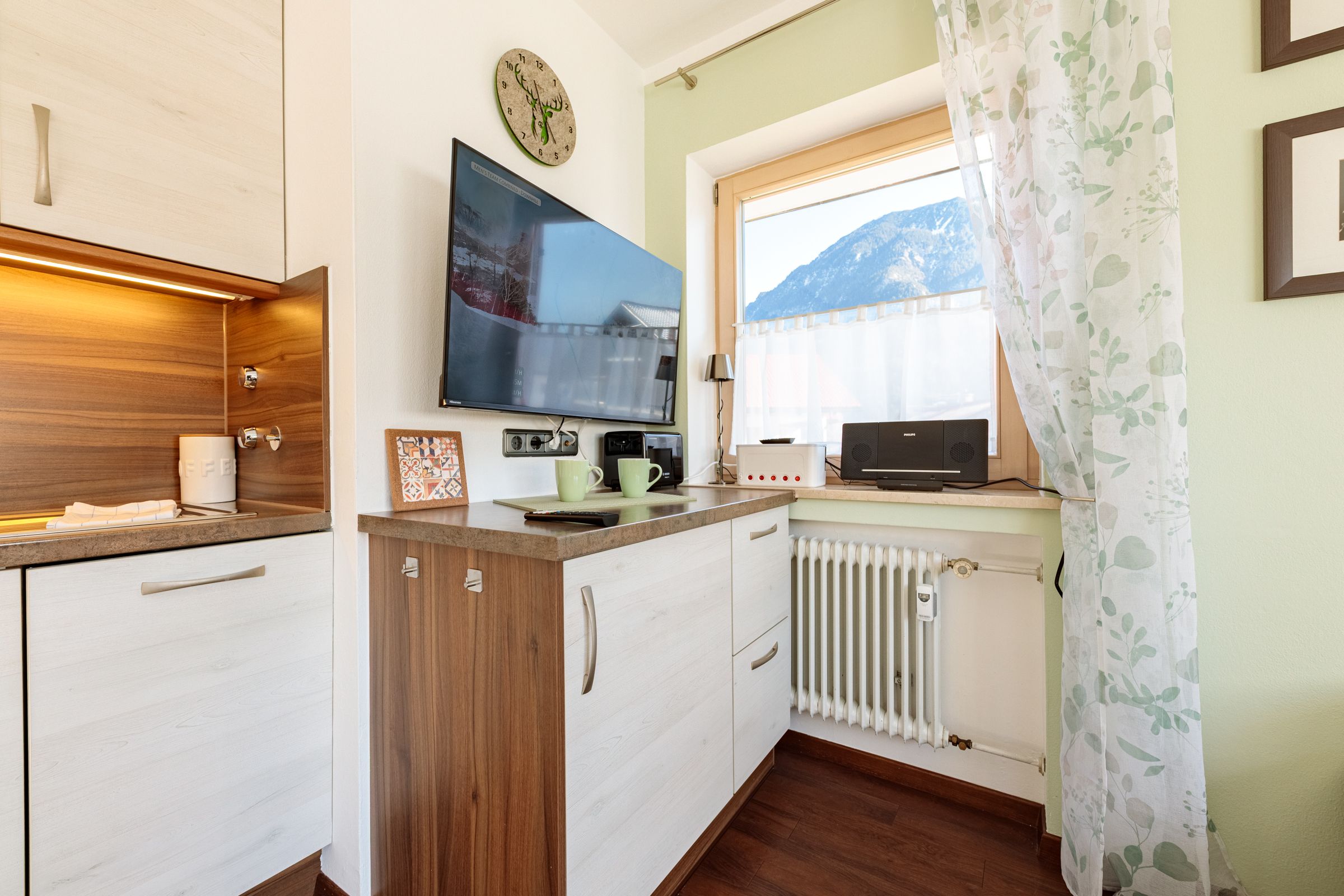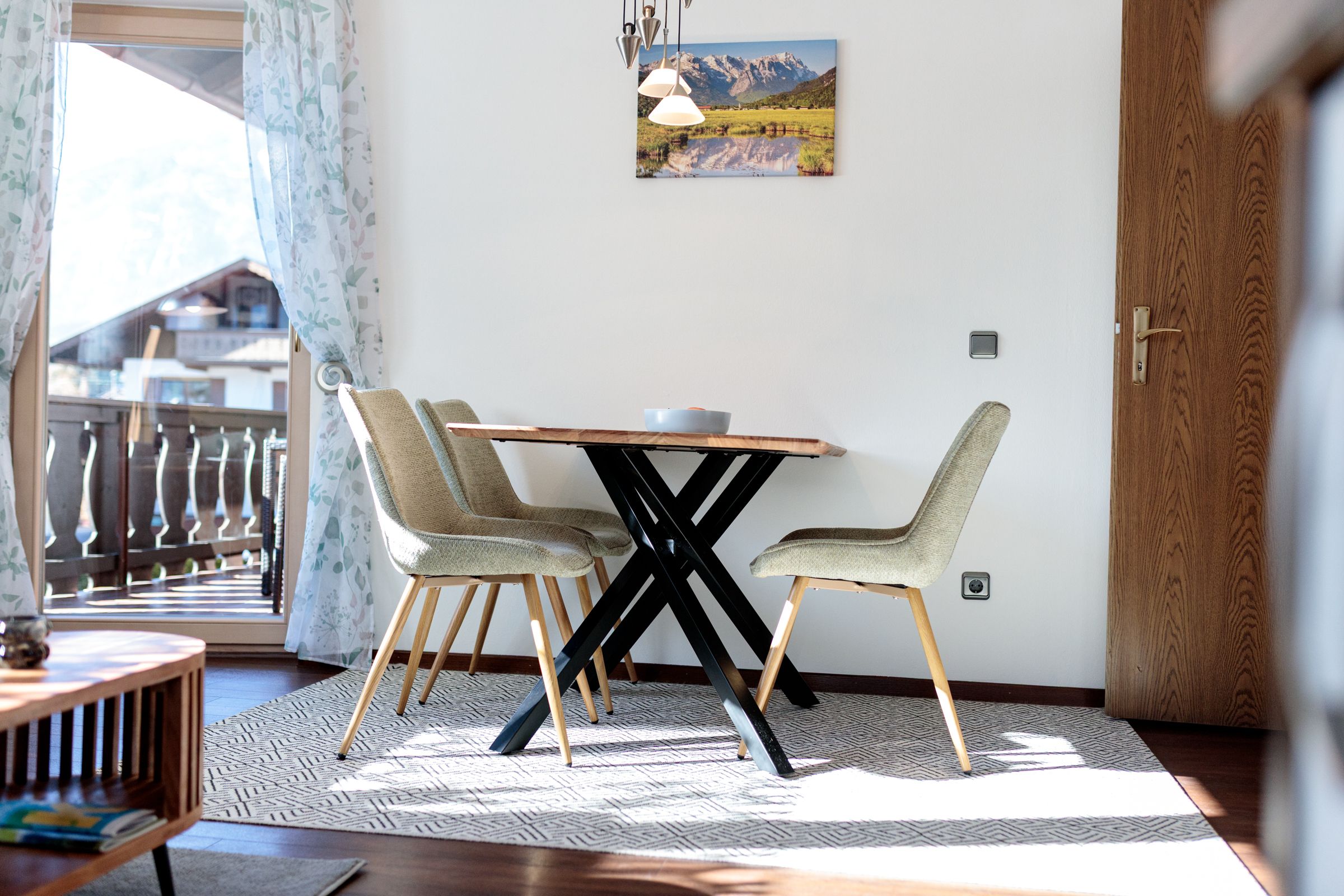 From the living area, you have direct access to the balcony, which is furnished with comfortable seating and offers wonderful mountain views. Here, you can breathe in the crisp Alpine air, start your day in complete relaxation, or wind down in the evening with a glass of wine while admiring the impressive landscape.